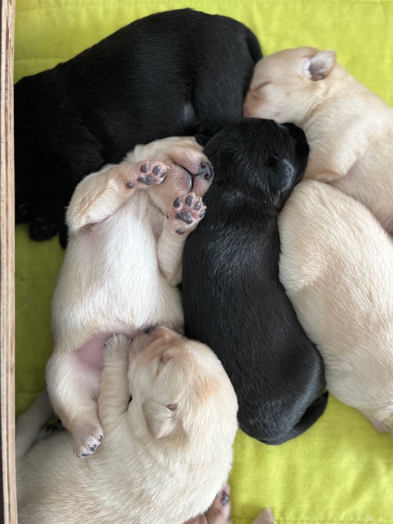 Nopan ja Floydin pennut syntyivät 26.3.2024. Pentueeseen syntyi 5 narttua (4 keltaista ja 1 musta) ja 2 urosta (musta ja keltainen).